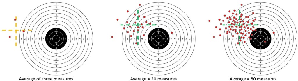 The precision is one important parameter to consider when using a sensor. The precision is the “closeness of agreement between indications or measured quantity values obtained by replicate measurements on the same or similar objects under specified conditions” (JCGM, 2012). The figure below show the importance of the number of measures for a sensor with a limited precision. If the repeated measures are very close, less measures are required and thus the measurement time is shorter (which is important for power consumption and response time).