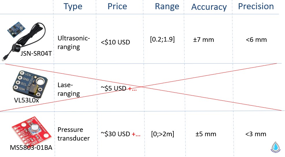 Both the ultrasonic (JSN-SR04T) and pressure (MS5803-01BA) sensors seem appropriate for water level monitoring in situations where an accuracy of ±10 mm is expected. The low-cost laser sensor VL530x is not appropriate for accurate water level monitoring, most likely because of the limited reflectivity of laser on the water surface.